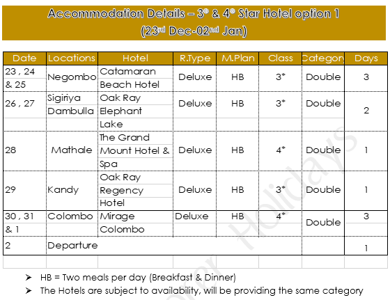 *Hotel name: Mirage Hotel Colombo(4*) or Marino Beach Colombo (4*)